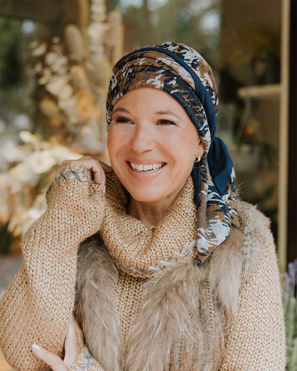 Doris Print Nordic es la versión invernal del clásico modelo Doris, diseñada especialmente para mujeres que atraviesan la pérdida de cabello. Su delicado estampado nórdico y su confección pensada para el otoño e invierno te permitirán lucir segura, elegante y cómoda en todo momento.
